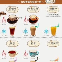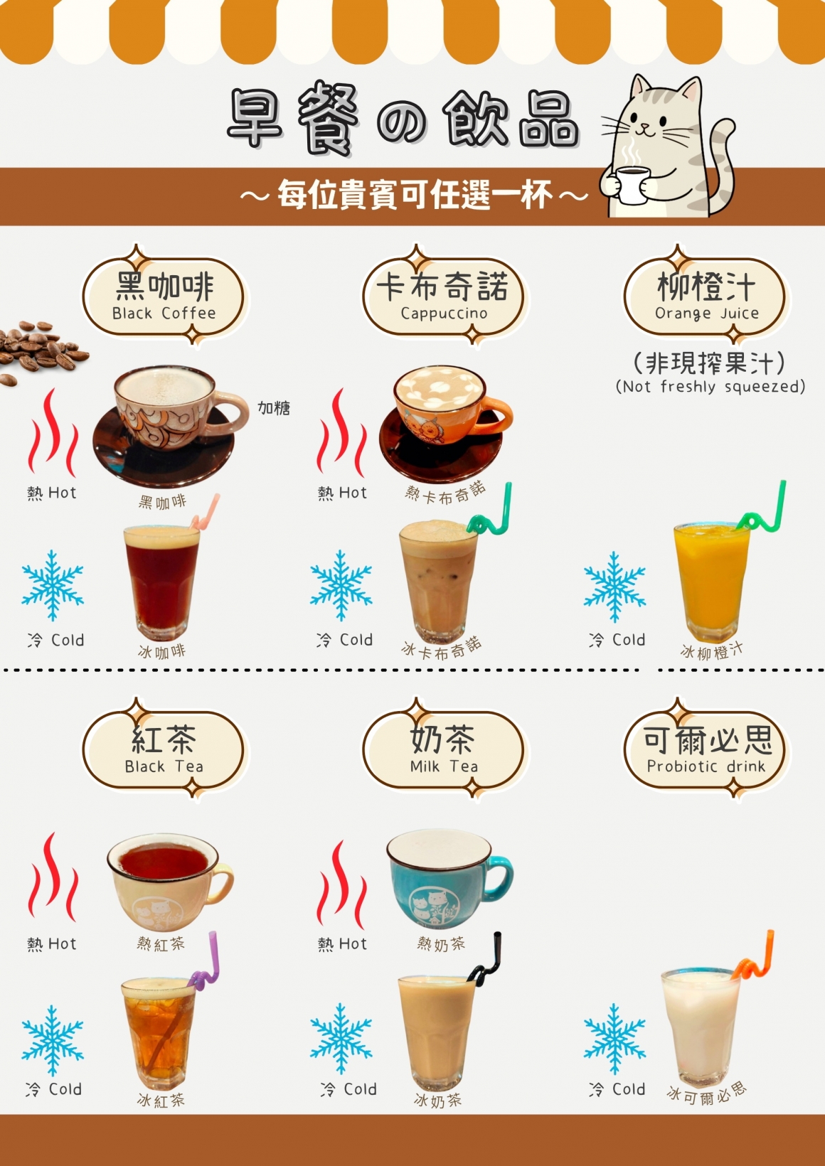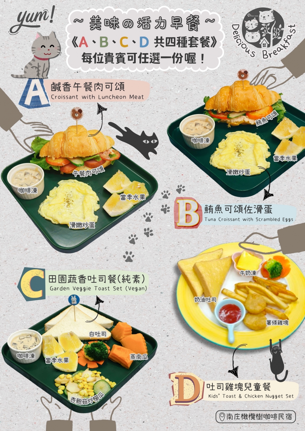 ◆ 提供四款西式活力早餐(A~D 套餐),入住時每位貴賓可任選一份,並搭配任選飲品。用餐時間為早上 8:00~10:00(素食者可選 C 套餐),逾時將無法提供餐點,敬請見諒。